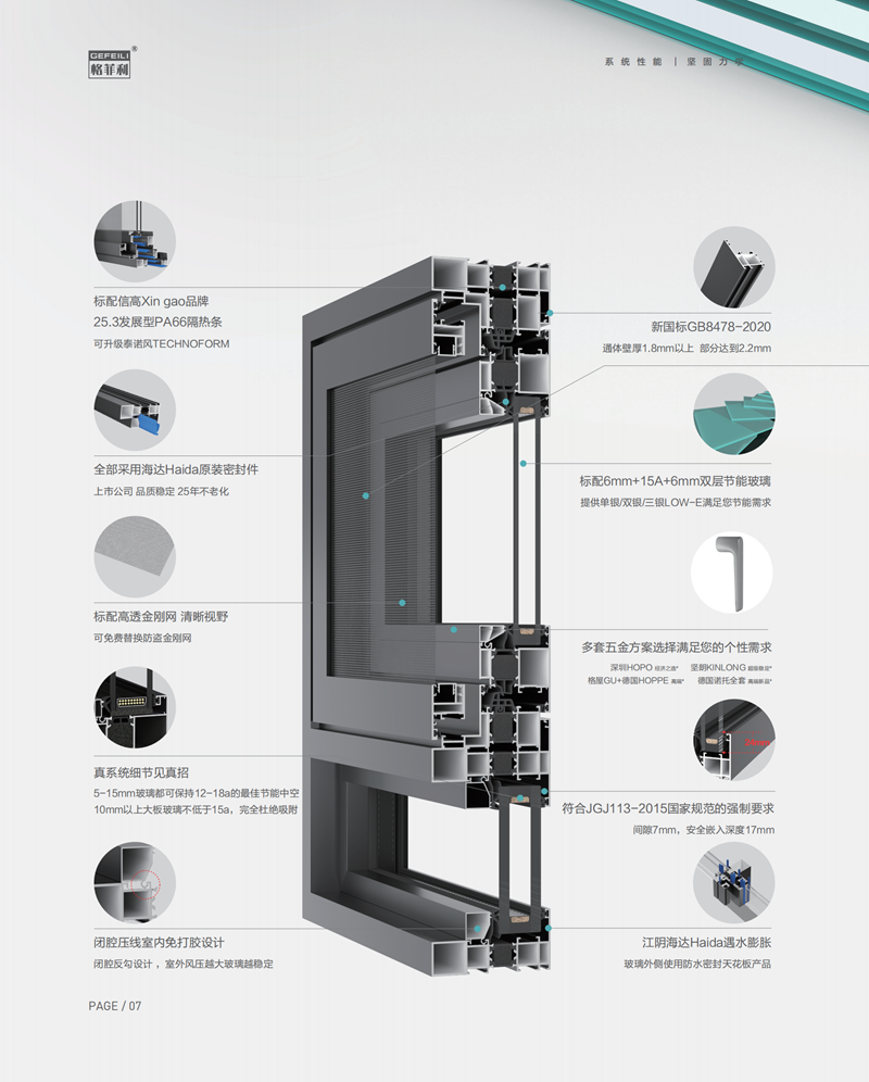 G112-190系列為格菲利公司王牌產(chǎn)品、其標(biāo)配的190型加強(qiáng)立柱,可以滿足窗戶高度6米的大尺寸要求。型材采用無(wú)限連接工藝,可以滿足任意的整框要求!